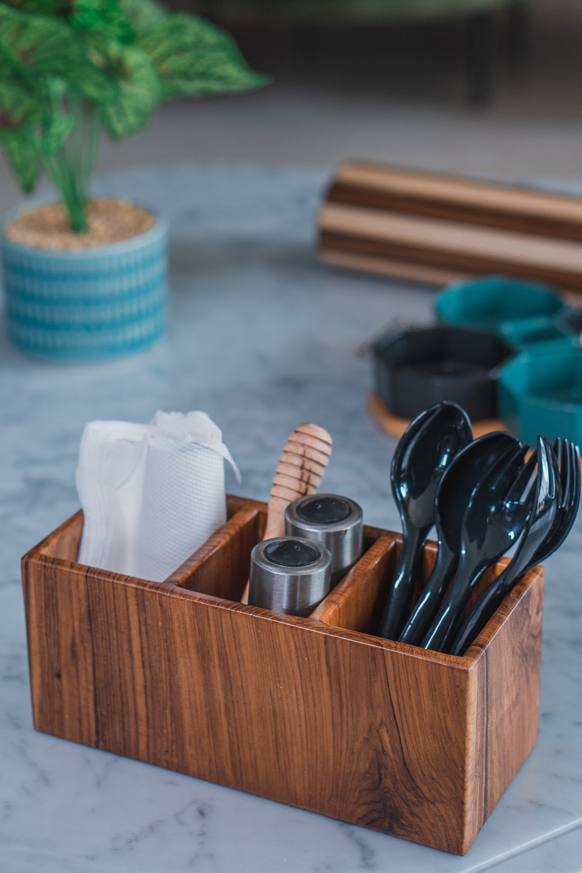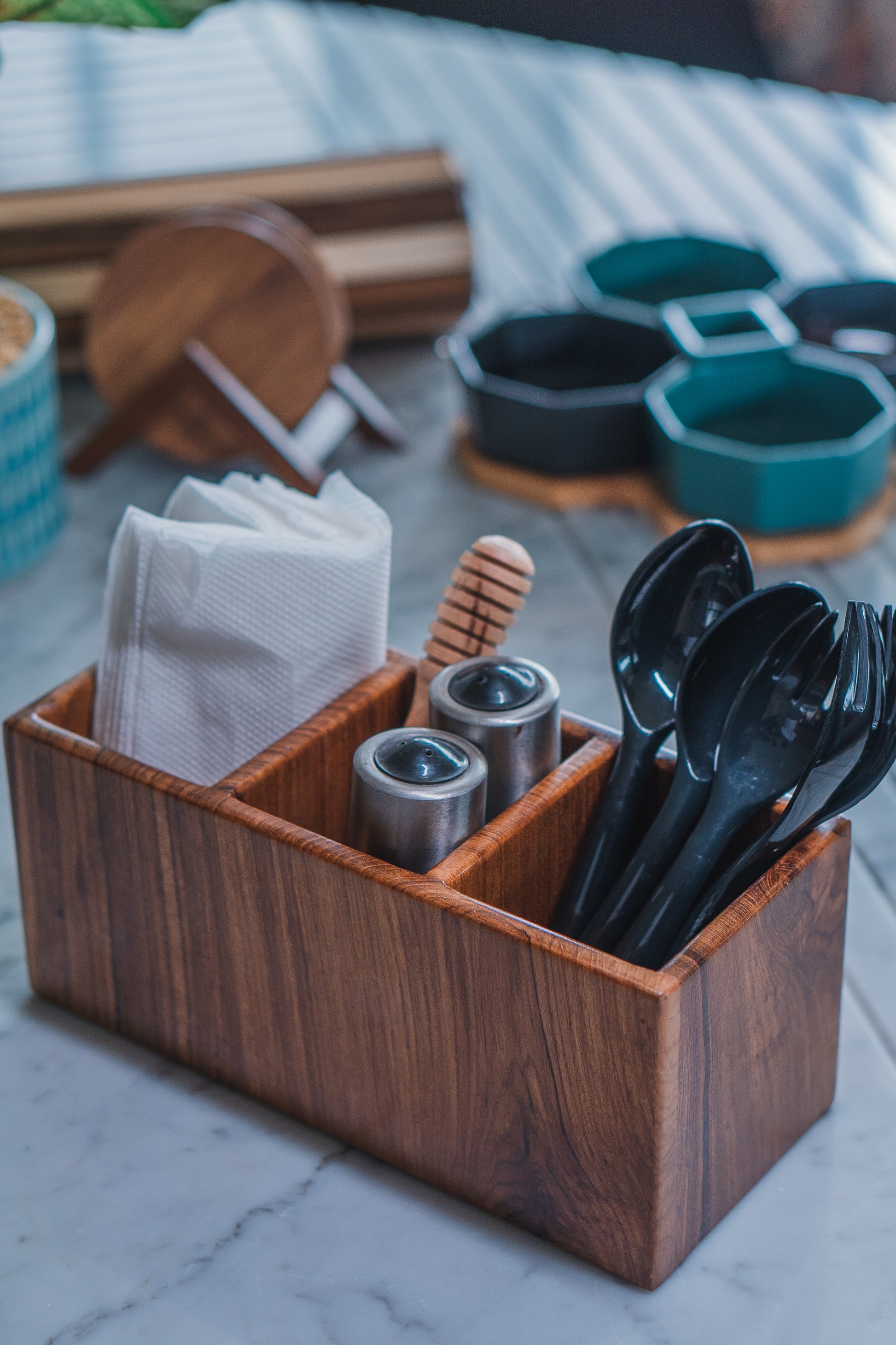 - Keeps your essentials neatly organized and within reach while cooking or dining.