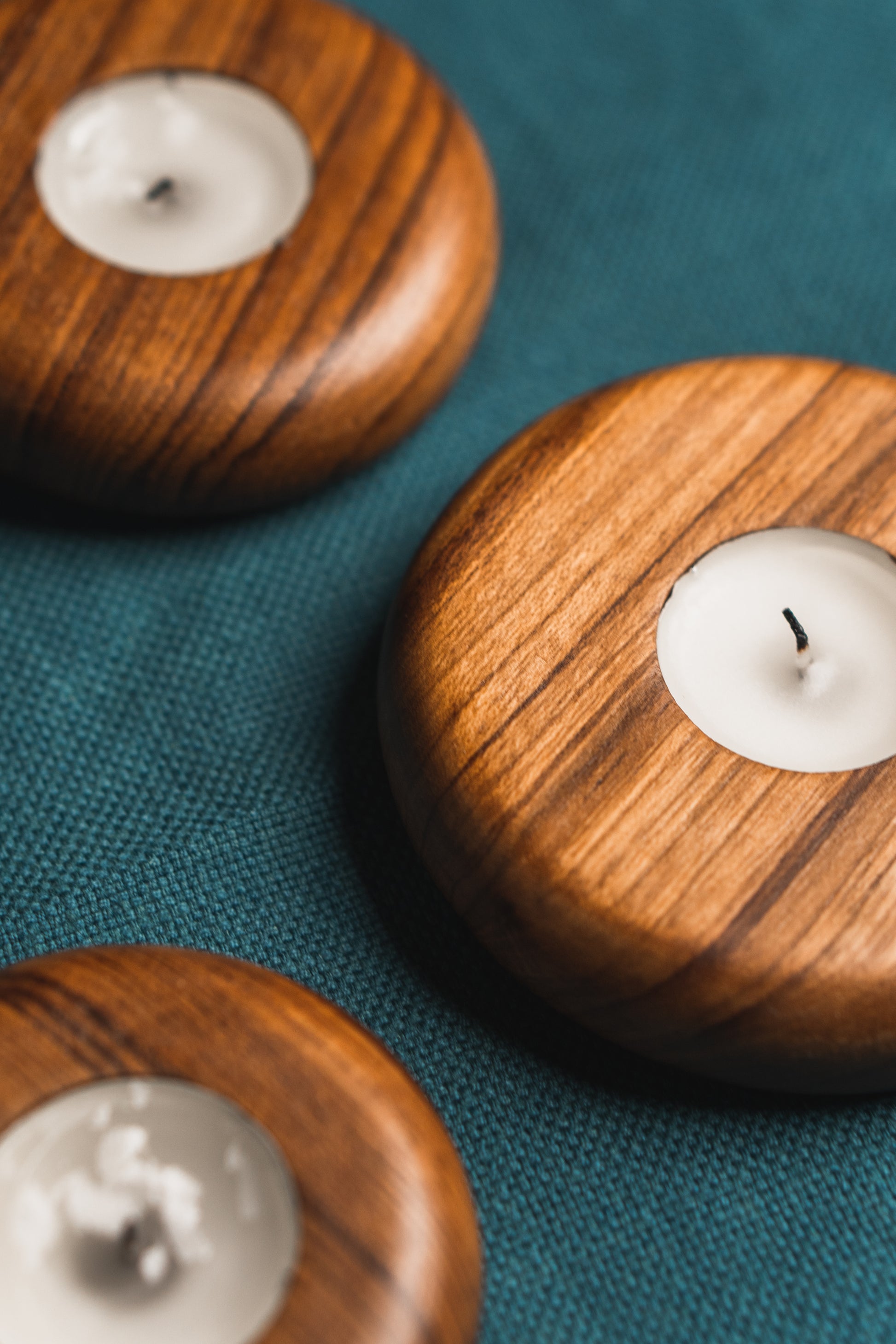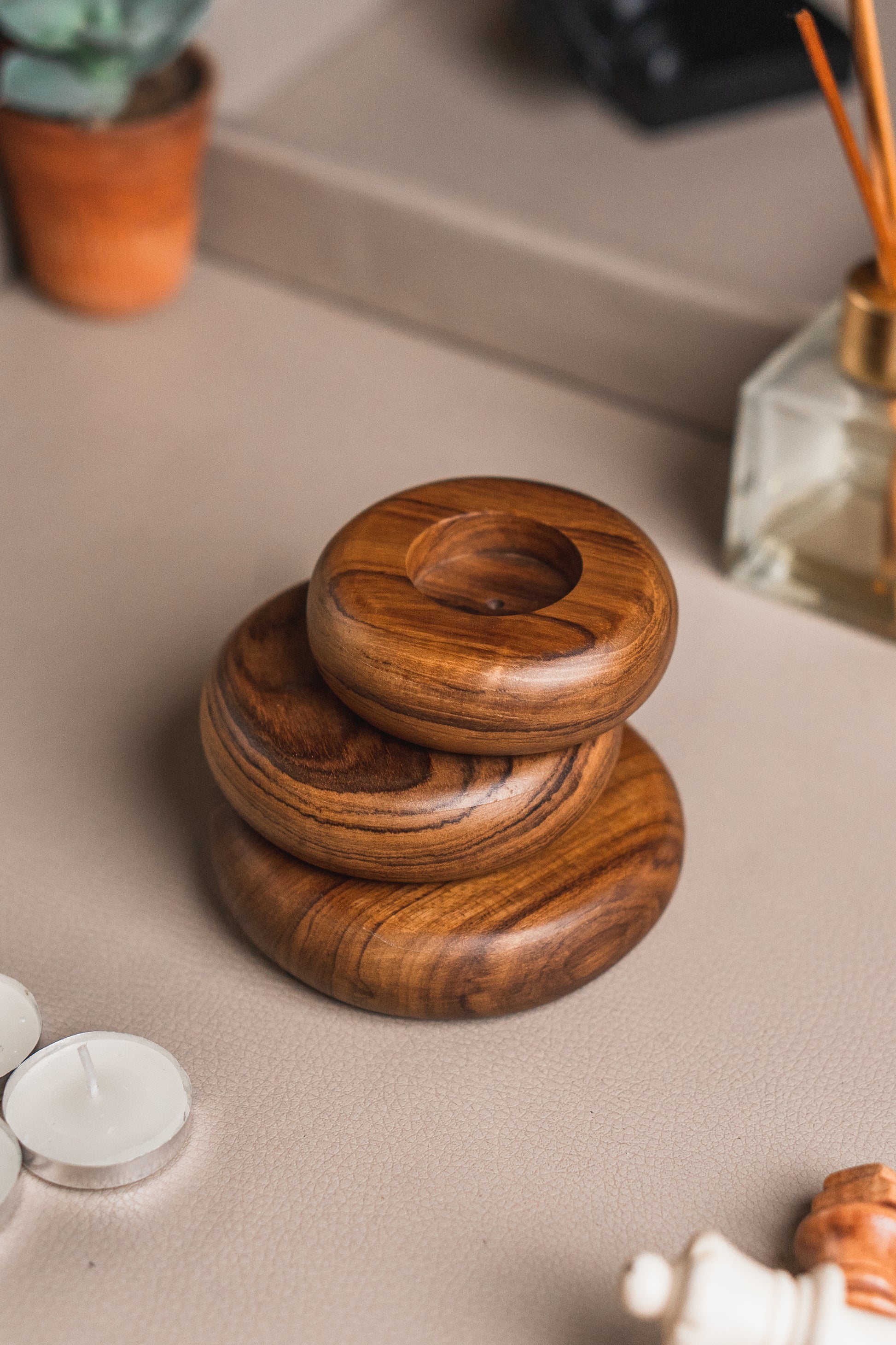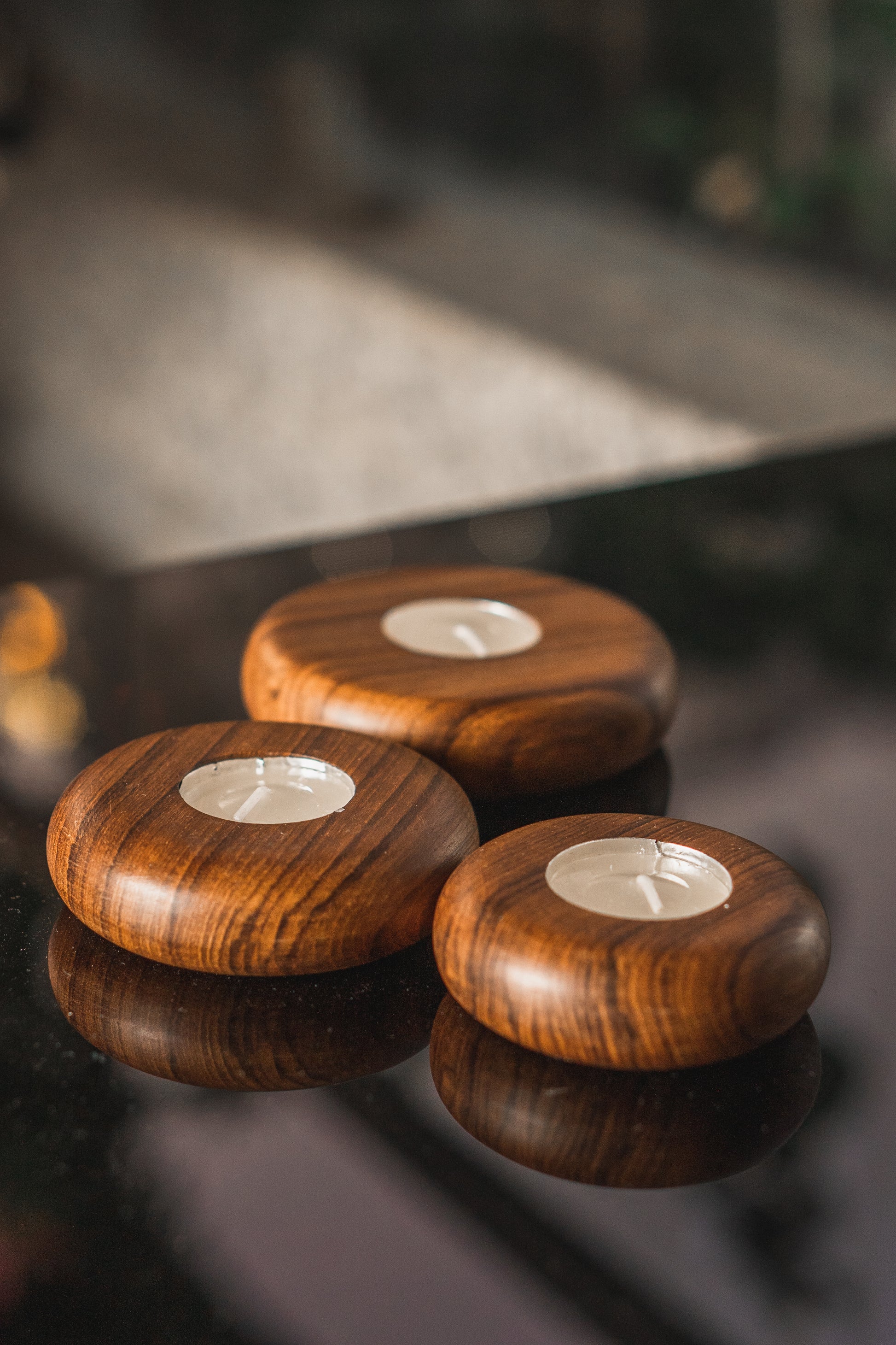 Add warmth, charm, and elegance to your home décor with the Tea Light Candle Holders - Set of 3 (Round) by Old Trunk. Handcrafted from natural Valsadi Teak Wood, these candle holders feature a beautiful rustic design, perfect for creating a cozy and romantic ambiance for any occasion.
